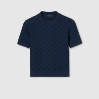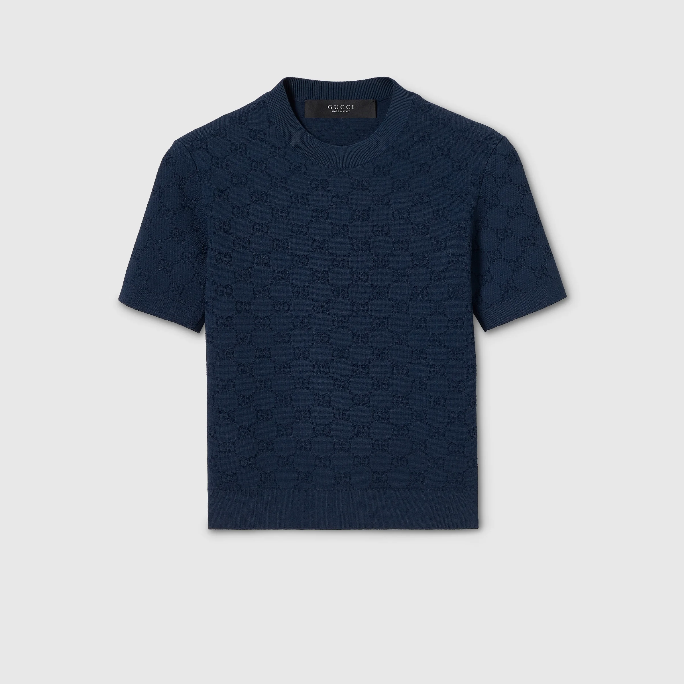 Introducing Spring Summer 2026. This style is inspired by the "La Principessa" look of La Famiglia. The collection reinterprets the House’s codes through singular personalities and distinctive aesthetic attitudes. This top is presented in GG fabric jacquard. - Navy GG fine viscose jacquard - Rib trim - Crewneck - Short sleeves - Length: 19.09", based on a size XS - Made in Italy - Fabric: 85% Viscose, 15% Polyester - Trimming: 73% Viscose, 14% Polyester, 12% Polyamide, 1% Elastane