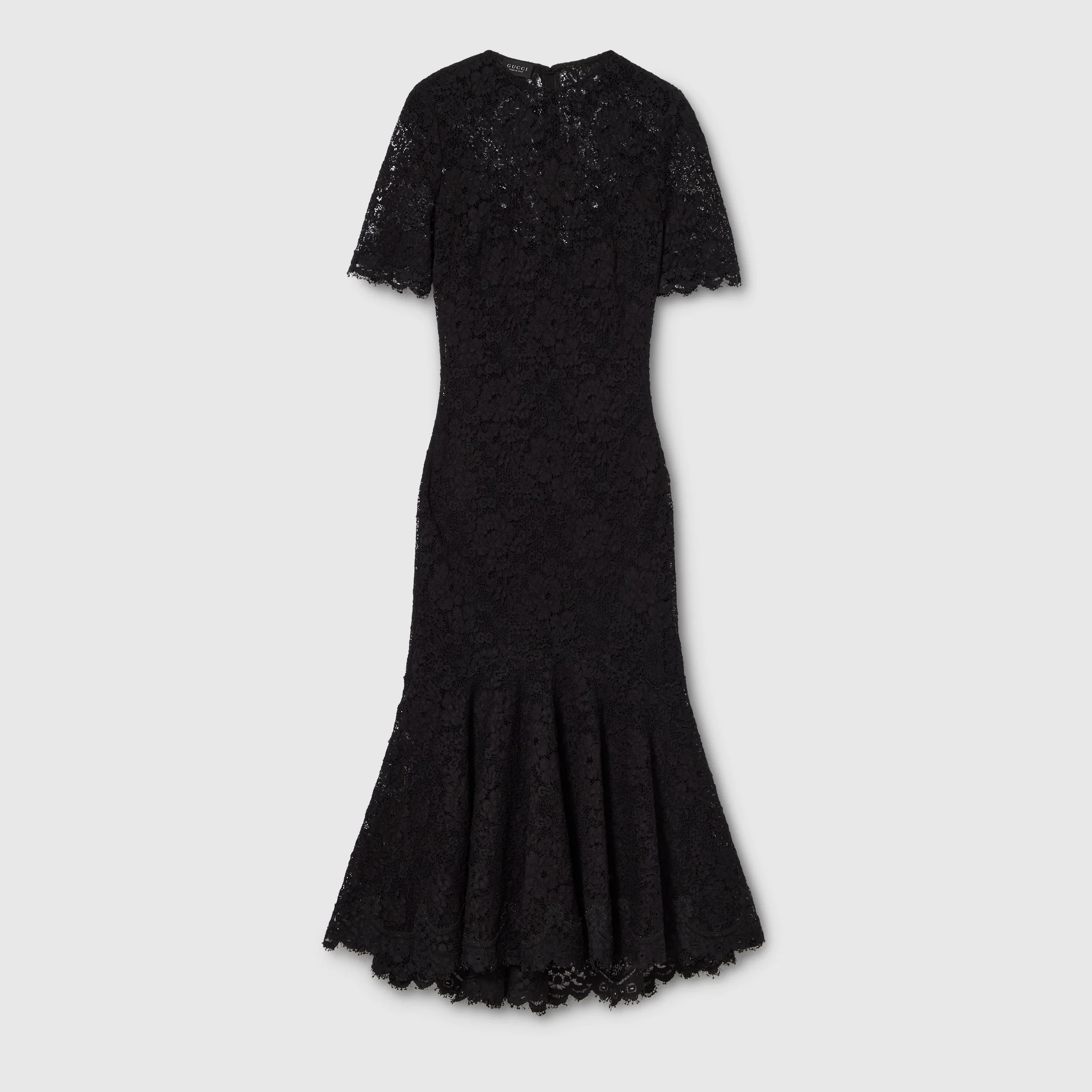 Introducing Spring Summer 2026. This style is inspired by the "La Sciura" look of La Famiglia. The collection reinterprets the House’s codes through singular personalities and distinctive aesthetic attitudes. This dress is presented in black GG flower stretch lace. - Black GG flower stretch lace - Detachable lining - Short sleeves - Back zip closure - Length: 46.1", based on a size 38(IT) - Made in Italy - Dress: Fabric: 49% Viscose, 26% Cotton, 20% Polyamide, 5% Elastane - Trimming: 46% Viscose, 31% Cotton, 19% Polyamide, 4% Elastane - Trimming: 38% Viscose, 36% Cotton, 19% Polyamide, 7% Elastane - Petticoat: Body: 78% Polyester, 22% Elastane