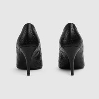 The latest women's shoes collection comprises elegant silhouettes. The pump with Horsebit expresses the House's emblematic style, complemented by a pointed toe and cone-shaped heel. - Black GG leather - Light gold-toned hardware - Leather lining - Horsebit - Point toe - Leather sole - Cone-shaped mid-heel - 3.3" height