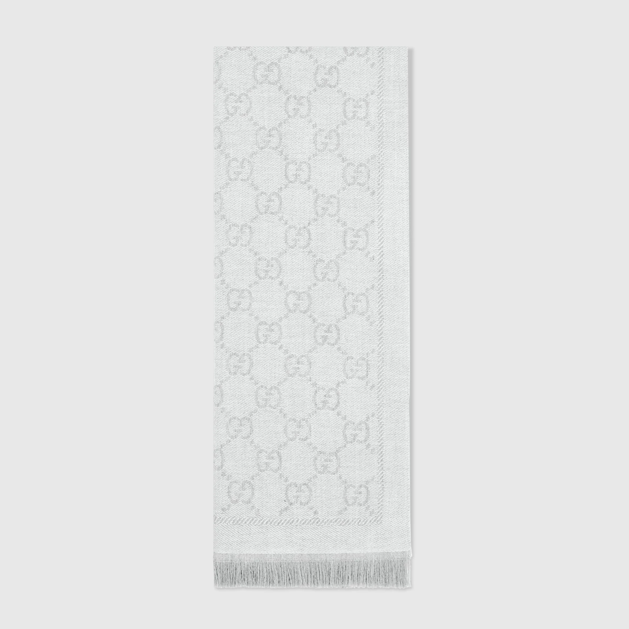 Refined with fringe edges, this double jacquard wool scarf features the House's trademark GG pattern, first introduced in the '70s. - Silver with light grey GG - Fringe edges - 19"W x 70"L - Made in Italy