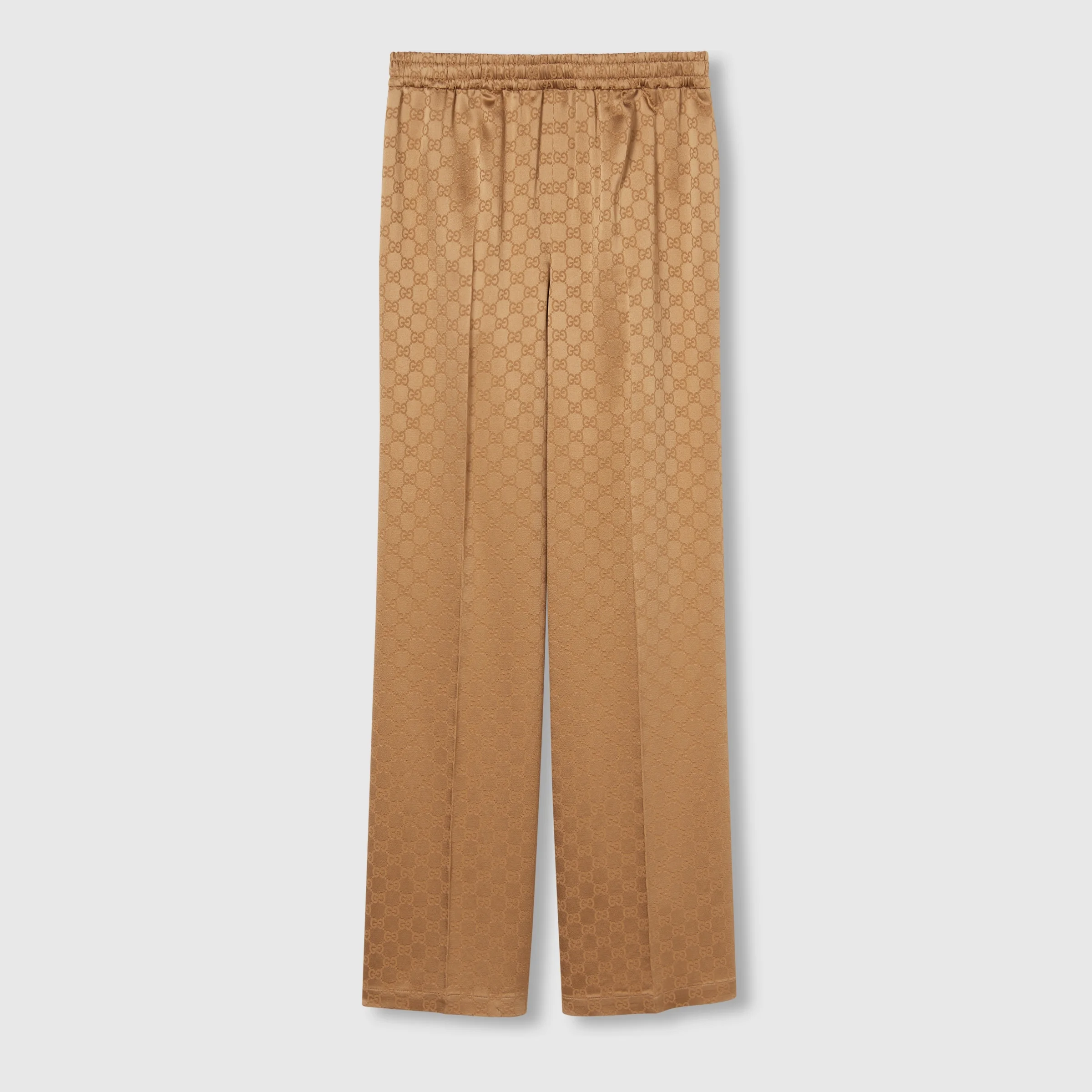 The Pre-Fall selections spotlight essential silhouettes with emblematic details, offering a modern take on the House's well-known codes and symbols. This contemporary pair of pants is presented in camel with a GG motif and matte-finish fabric. - Camel GG viscose jacquard with a matte effect - Contrast white piping at the sides - Elastic waistband with drawstring - Pleats - Hips: 21.6 " based on a size S (IT) - Waist: 27.5 " based on a size S (IT) - Cut for a relaxed fit - Length: 44.4"; based on a size S - Made in Italy - The product shown in this image is a size small