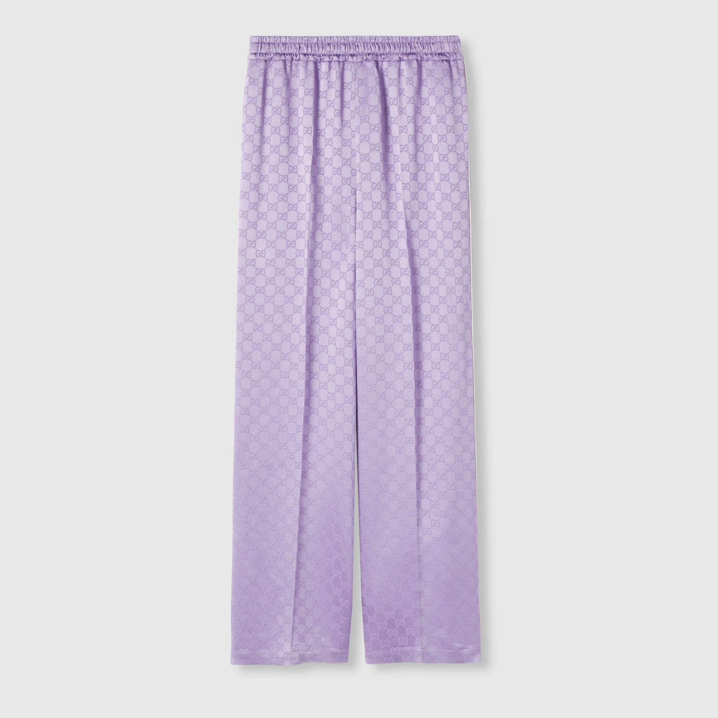 The Pre-Fall 2025 collection re-envisions traditional ready-to-wear through subtle yet innovative details. This pair of pants with an elastic waistband is presented in a casual GG viscose jacquard, taking inspiration from founder Guccio Gucci's monogram. - Lilac GG viscose jacquard - Elastic waistband with internal drawstring - Two side pockets - Pleats - Hips: 21.6 " based on a size S (IT) - Waist: 27.5 " based on a size S (IT) - Relaxed fit - Half waist: 13.8"; Half hips: 21.7"; Half hem width: 11.6" based on a size s - Made in Italy - Fabric: 55% Viscose, 45% Acetate - Details: 73% Acetate, 27% Silk - Pocket lining: 73% Acetate, 27% Silk