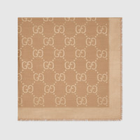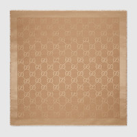 Crafted from a silk wool blend, this camel jacquard shawl features the House's emblematic GG pattern, first introduced in the '70s. As an renowned symbol of Gucci's heritage, the GG logo is continually reimagined and reintroduced through a contemporary lens. - Camel silk wool GG jacquard - Fringe trim - 55.1"W x 55.1"L - Made in Italy
