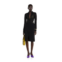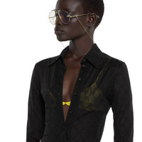 In the Cruise 2026 collection, crystal embellishment is featured in attires that glow from day to night, revisiting signature motifs such as the GG pattern and Horsebit motif. Crafted from GG sheer jersey jacquard, this shirt is finished with a polo collar. - Black GG sheer jersey jacquard - Polo collar - Long sleeves - Front button closure - Length: 21.2" based on a size XS
