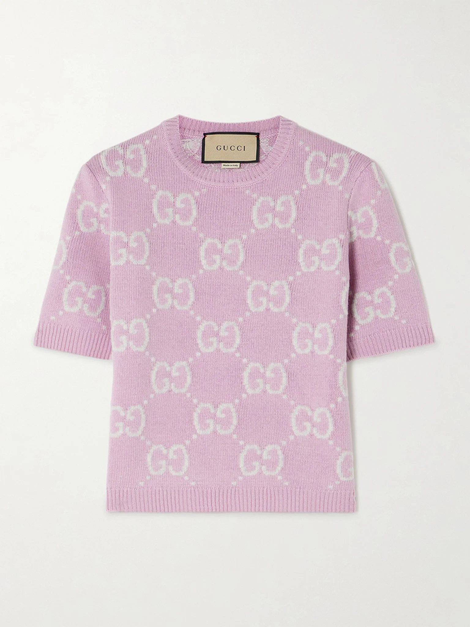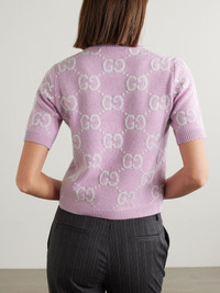 Gucci's wool sweater is jacquard-knitted with the label's monogram in a soft and pretty palette of pink and white. Style yours solo or layered over a long-sleeve shirt. Details & Care - Pink and white wool-jacquard - Slips on - 100% wool - Dry clean