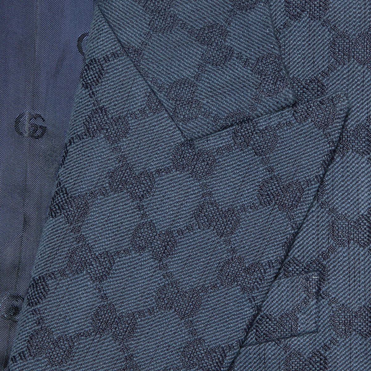 Distinguished textures and vibrant palettes exude a warm feeling, as one season ends and another one begins. This contemporary single-breasted jacket is presented in a light blue GG linen cotton jacquard, making a curated transition into Pre-Fall. - Light blue and blue GG linen cotton jacquard - Self-covered buttons - Lined - Notch lapel - Single breasted - Four front pockets - Buttoned cuffs - Button closure - Length: 33.4", based on a size 40 (IT) - Made in Italy - The model is 5'7" and is wearing size 40 (IT)