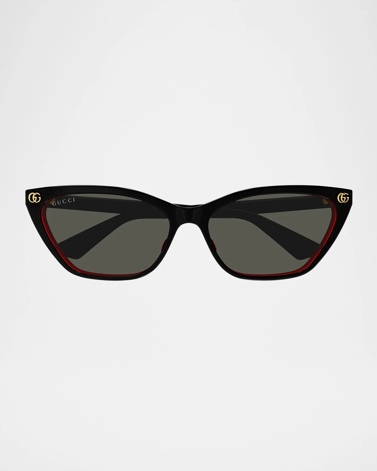 - Gucci "GG1815S" cat-eye sunglasses in acetate - Eye/bridge/temple (in mm): 58-15-140 - Solid lenses; right logo script - Saddle nose bridge - GG logo at temples - Thin, tapered arms - 100% UVA/UVB protection - Made in Italy - Proposition 65 warning for California residents