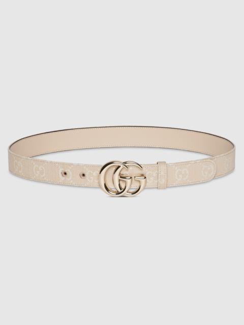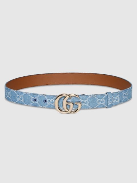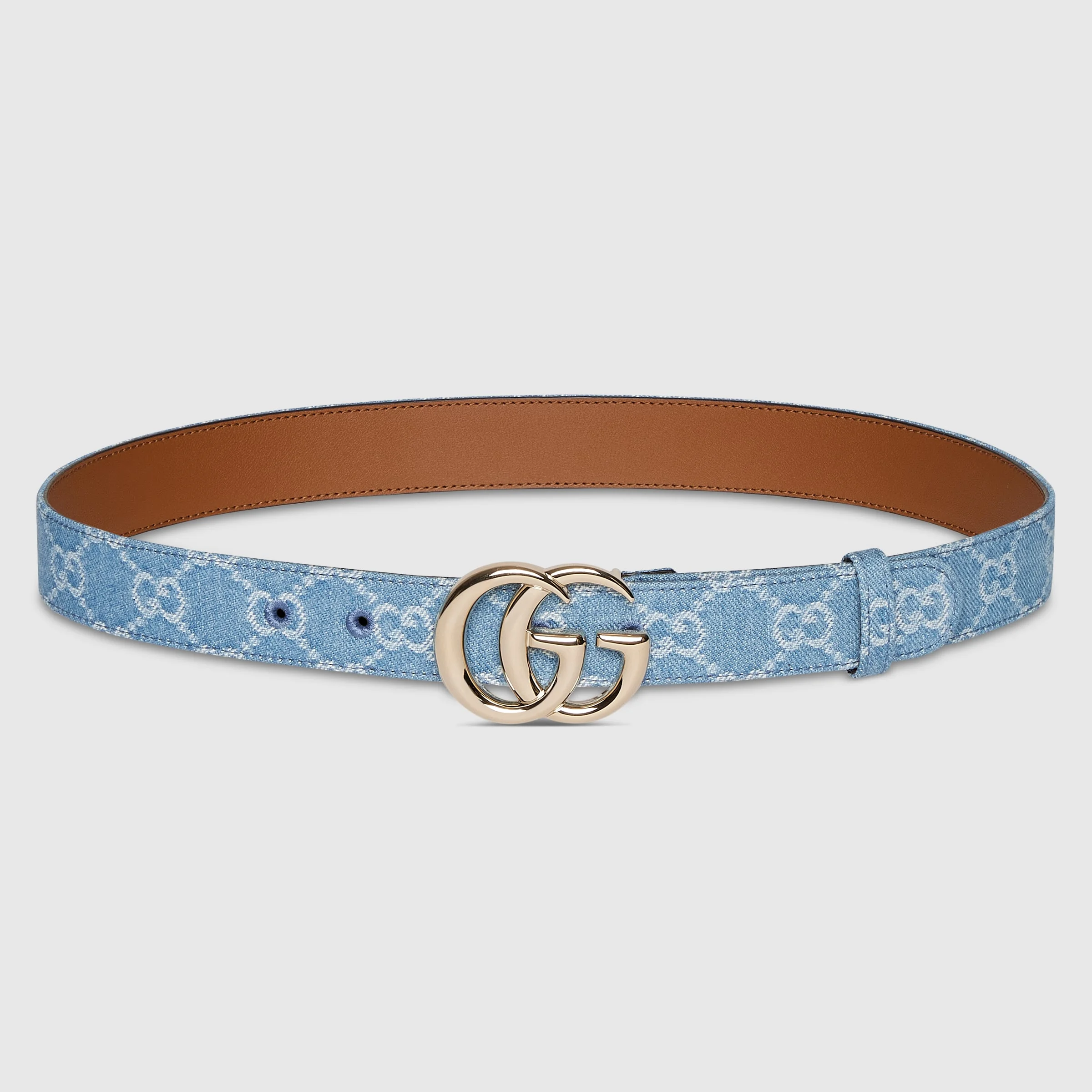This everyday belt is presented as part of the Pre-Fall 2025 collection. Taking inspiration from the heritage of the House, it's crafted from GG denim jacquard and defined by a light gold-toned Double G buckle. - Blue and white GG denim jacquard - Light gold-toned hardware - Double G buckle - 1.2" width - Made in Italy - Can be worn as a hip or waist belt. Sizing will differ based on where the belt is worn, please refer to the size guide to find your size.