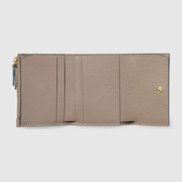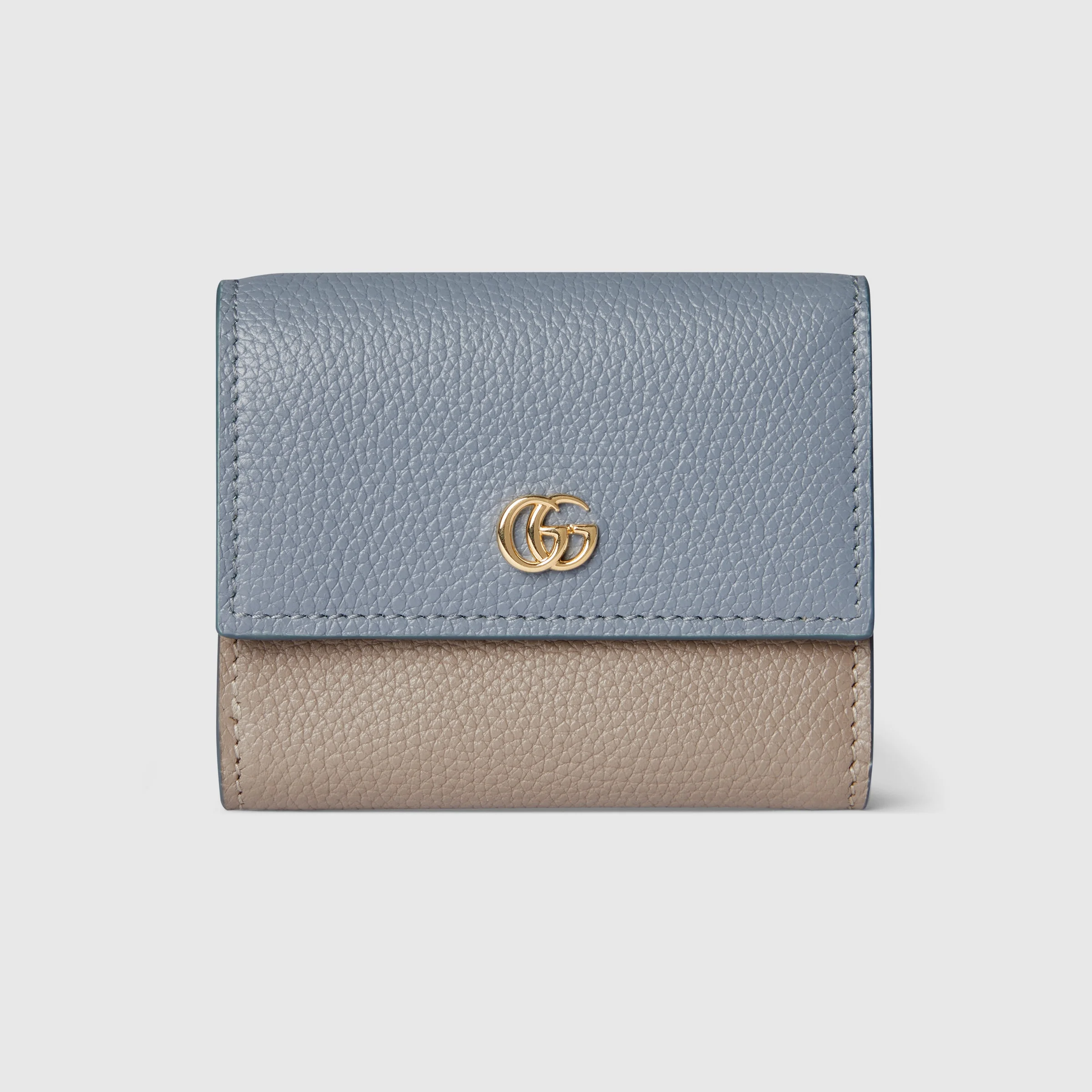 GG Marmont features colourful iterations, elevating signature silhouettes with new functions. This bi-color mini wallet is presented in leather in two neutral shades, enriched with the Double G detail. - Light blue and beige leather - Gold-toned hardware - Taupe taffeta lining - Double G - Inside: 2 card slots, 2 flat internal pockets, 1 bill compartment, 1 zip pocket - Outside: 1 flat back pocket - Button closure - Closed: W3.9" x H3.1" x D0.6"; Open: W8.3" x H3.9" - Weight: 0.41lbs approximately - Made in Italy