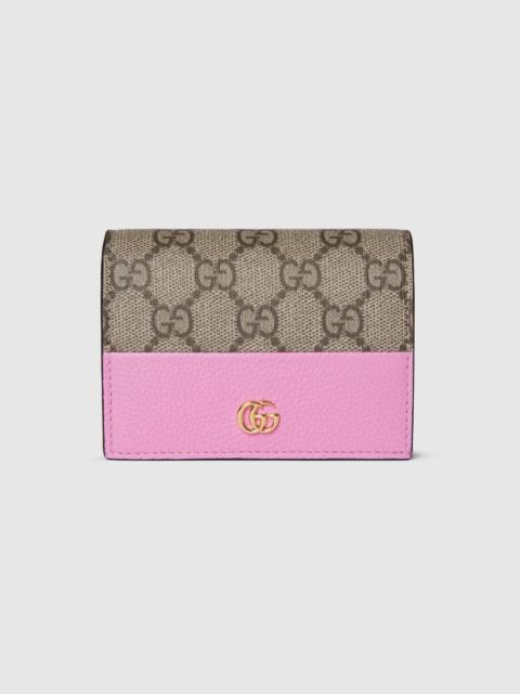 This GG Marmont mini wallet is crafted from leather in Gucci Rosso Ancora red, contrasted with beige and dark brown GG Supreme. The structured design features the signature Double G hardware in gold-tone. - Gucci Rosso Ancora red leather, beige and dark brown GG Supreme - Light gold-toned hardware - Gucci Rosso Ancora red taffeta lining - Double G - Five card slots, one open pocket - One bill compartment - Interior zipper pocket - Snap closure - Closed: 4.3"W x 3.3"H x 1.2"D; Open: 4.3"W x 6.9"H - Weight: 0.29lbs approximately - Made in Italy