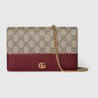 This GG Marmont wallet on chain pairs Gucci Rosso Ancora red leather with beige and dark brown GG Supreme. The structured silhouette is adorned with the signature Double G hardware. The accessory features a detachable chain strap for effortless transition from day to night. Compact yet functional, the interior offers organized space for cards, essentials. - Gucci Rosso Ancora red leather, beige and dark brown GG Supreme - Light gold-toned hardware - Gucci Rosso Ancora red taffeta lining - Double G - Inside: 6 card slots, 1 flat pocket, 1 zip pocket with gusset, 1 open compartment - Mirror - Removable chain shoulder strap with 23.5" drop - Snap button closure - Weight: 0.88lbs approximately - 8"W x 5"H x 1.5"D - Made in Italy - Fits up to iPhone Pro Max/Plus, Airpods, and lipstick