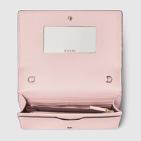 The GG Marmont collection introduces bi-color styles. This wallet on a chain is presented in pink leather with beige and dark brown GG Supreme. The signature Double G detail completes the piece. - Pink leather, beige and dark brown GG Supreme - Light gold-toned hardware - Dark pink taffeta lining - Double G - Inside: 6 card slots, 1 flat pocket, 1 zip pocket with gusset, 1 open compartment - Mirror - Removable chain shoulder strap with 23.5" drop - Snap button closure - Weight: 0.88lbs approximately - 8"W x 5"H x 1.5"D - Made in Italy - Fits up to iPhone Pro Max/Plus, Airpods, and lipstick
