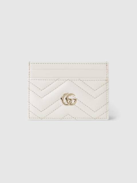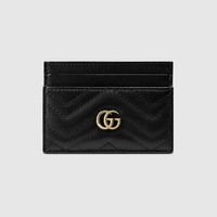The GG Marmont collection is defined by the emblematic Double G hardware—a contemporary take on a Gucci archival belt buckle from the '70s that has become a hallmark of the House. The card case is crafted in soft matelasse leather that coordinates with bags of the collection. - Black matelasse chevron leather with GG on the back - Double G - Inside: 4 card slots, 1 open compartment - 4"W x 2.5"H - Weight: 0.14lbs approximately - Made in Italy - Antique gold-toned hardware