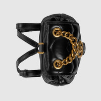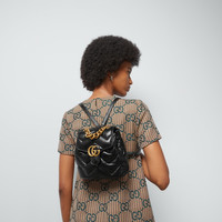 The GG Marmont backpack is presented in a small, softly structured variation in chevron matelassé leather. The Double G hardware, inspired by an archival design, enriches the flap, which hides an internal drawstring. - Black matelassé chevron leather - Gold-toned metal hardware - Microfiber lining with a suede-like finish - Part of the - selection, this product is embedded with NFC technology—an innovative way to authenticate and experience your item digitally. - Double G - Adjustable chain and leather straps - Interior open pocket - Chain handle drop: 2.3" - Shoulder straps with 13.3" drop - W7.5" x H7.8" x D4.3" - Made in Italy