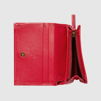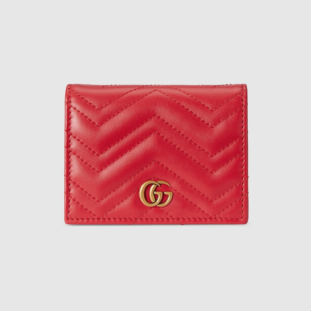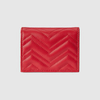 The GG Marmont card case wallet is crafted from quilted matelassé chevron leather in a shade of red that mirrors the vibrant hues to the Pre-Fall 2023 collection. The shape is defined by the line's emblematic Double G hardware, an archival symbol from the 1970s that has become a hallmark of the House. - Red matelassé chevron leather - Gold-toned hardware - Moiré lining - Double G - Five card slots - Two flat pockets - One zip pocket - Interior open pocket - Snap closure - Closed: 4.5"W x 3.5"H x 1"D - Open: 4.5”W x 7”H - Made in Italy