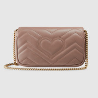 The GG Marmont mini bag has a key ring that can be used to attach it to a separate larger bag. It has a softly structured shape and a flap closure with Double G hardware. The hardware is inspired by an archival design from the '70s. Made in matelassé chevron leather. - Dusty pink matelassé chevron leather with dusty pink leather detail - Gold-toned hardware - Attached key ring that can attach to a separate bag - Double G - Chain shoulder strap with 23.6" drop - This item can fit a cell phone up to 2.7”W x 5.8”H x .3”D - The Gucci card case wallet will fit inside this product - Weight: .35kg approximately - Super mini size: 6.2"W x 4"H x 1.7"D - Made in Italy - The model is 5'11" tall