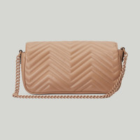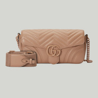 Emblematic styles that are dear to the House continue to explore new expressions across each new collection. The GG Marmont is characterized by the unmistakable Double G hardware and materials with an intricate matelassé finish. Here, this shoulder bag is presented in rose pink leather with tonal hardware. - Rose pink matelassé chevron leather - rose pink leather - Double G - Detachable shoulder strap with 15" drop - Chain shoulder strap with 8.7" drop - 10.4"W x 5.1"H x 2.7"D - Made in Italy