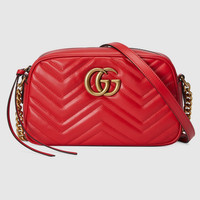 Crafted from red matelassé leather, this small GG Marmont chain shoulder bag has a softly structured shape and a zip top closure with the Double G hardware. The chain shoulder strap has a leather shoulder detail. - Red matelassé chevron leather - Antique gold-toned hardware - Microfiber lining with a suede-like finish - Double G - Interior open pocket - Adjustable chain shoulder strap with 23.6" drop. Can also be worn as a crossbody bag. - Zip closure - Weight: .85lbs approximately - Small size: 9.5"W x 5"H x 3"D - Made in Italy