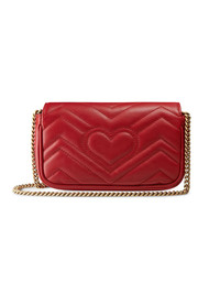 Gucci's signature small accessories are constantly evolving around a dynamic narrative. The leather goods collection is characterized by a bold red shade as part of the Pre-Fall 2023 collection. Here it defines a GG Marmont super mini bag with a gold-toned hardware. - Red matelassé chevron leather - Gold-toned hardware - Microfiber lining with suede-like finish - Attached key ring that can attach to a separate bag - Double G - Chain shoulder strap with 23.6" drop - This item can fit a cell phone up to 2.7”W x 5.8”H x .3”D - The Gucci card case wallet will fit inside this product - Weight: 12.4 oz approximately - Super mini size: 6.2"W x 4"H x 1.7"D - Made in Italy