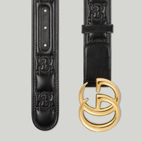 Each season, the House logo evolves in new creative ways. Here, the signature GG motif decorates this belt in Matelassé leather, topped with Double G hardware. This GG Marmont belt is crafted from black leather. - Black GG Matelassé leather - Gold-toned hardware - Double G buckle - Buckle: 3"W x 2.4"H - 1.5" belt width - Made in Italy - Can be worn as a waist belt. Sizing will differ based on where the belt is worn, please refer to the size guide to find your size.