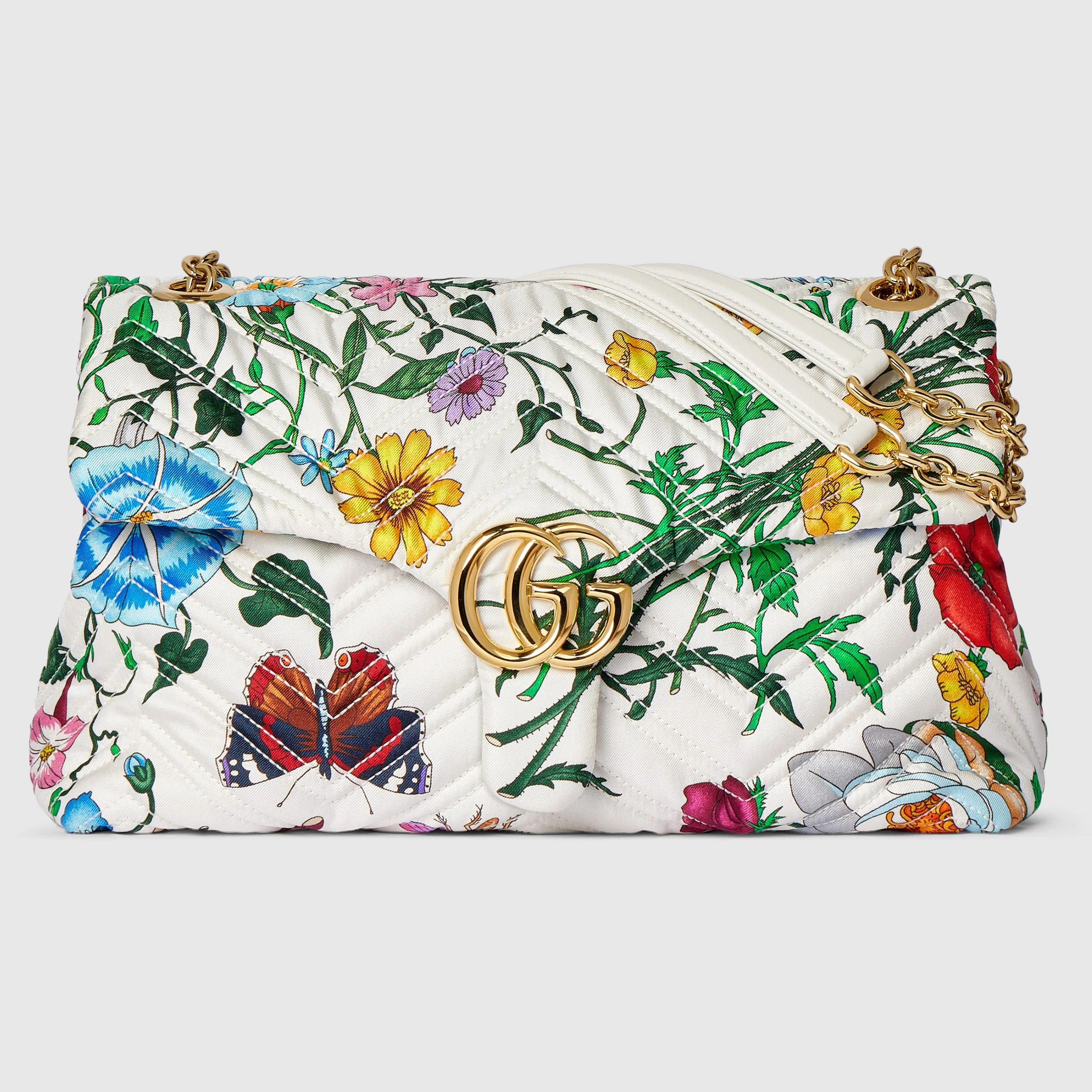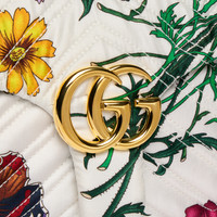 Introducing Spring Summer 2026. This GG Marmont shoulder bag highlights one of the House's signature styles in vivid colors. Crafted from Flora-motif silk twill, it is complete with gold-toned hardware. - White and multicolor Flora silk twill - Gold-toned hardware - Light pink silk satin lining - Double G - Inside: zip pocket - Outside: open back pocket - Sliding chain shoulder strap: 11" – 20.1" drop - Magnetic closure - W12.2" x H6.7" x D3.1" - Weight: approximately 1.1lbs - Made in Italy - Fits iPhone Pro Max/Plus, Airpods, long wallet, and lipstick