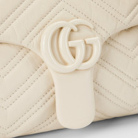 In the Fall Winter 2025 collection, the GG Marmont, a signature collection of the House, features the emblematic Double G, a faceted chain strap, and a soft, structured silhouette. This style is crafted from soft lightweight matelasse chevron leather and comes with a tonal enameled hardware and chain. - Ivory soft lightweight matelasse chevron leather - Tonal enameled hardware and chain - Ivory viscose lining - Double G - Inside: zip pocket - Sliding chain shoulder strap: 11" – 20.1" drop - W12.2" x H6.7" x D3.1" - Weight: approximately 1.1lbs - Made in Italy - Fits iPhone Pro Max/Plus, Airpods, long wallet, and lipstick