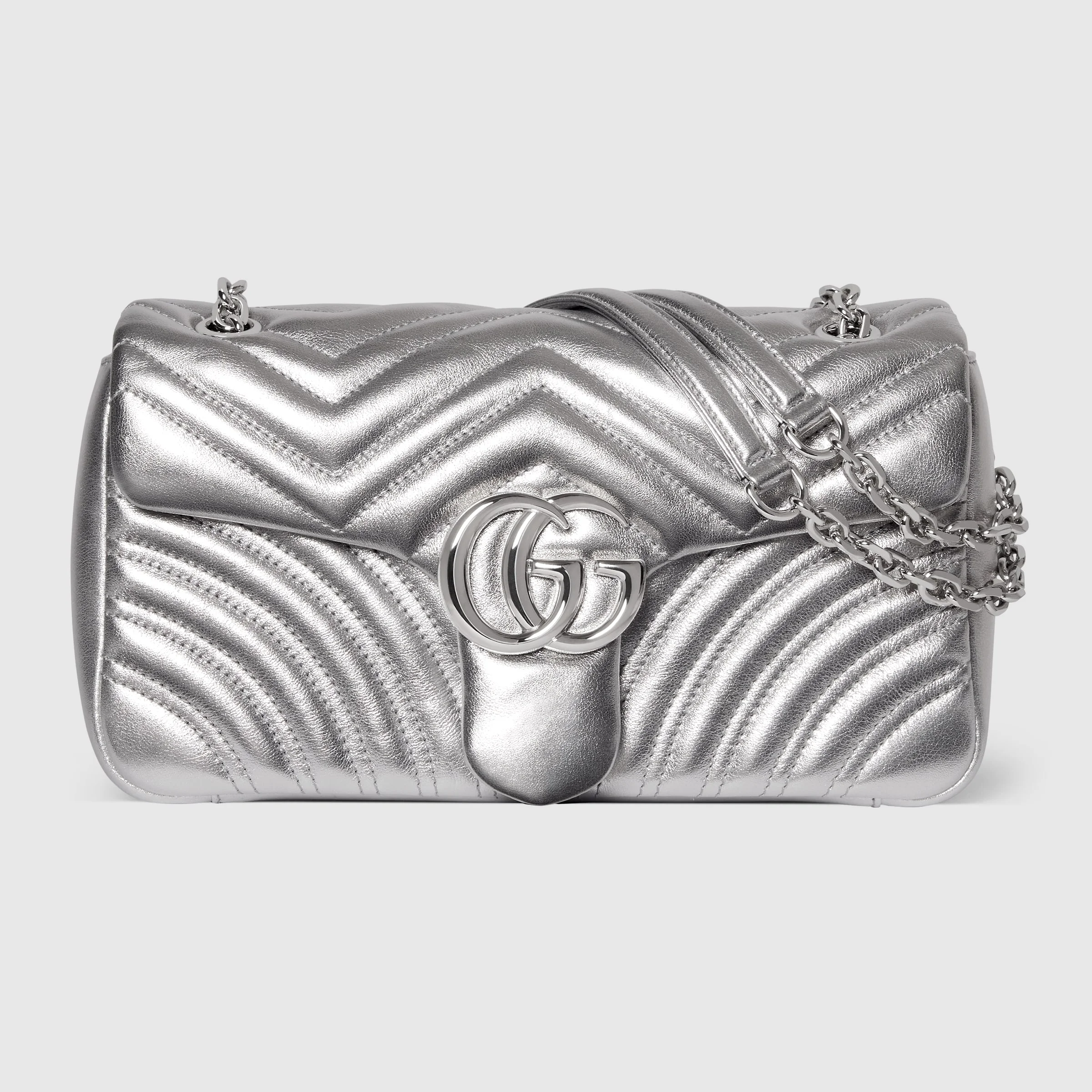 The GG Marmont, a signature collection of the House, features the Double G hardware, a faceted chain strap, and soft construction, introducing lame leather on this shoulder bag silhouette. - Metallic silver matelasse chevron lame leather - Silver-toned hardware - Light pink viscose lining - Double G - Inside: 1 zip pocket - Outside: 1 open pocket - Sliding chain strap can be worn as a shoulder strap with 22" drop - Flap with spring closure - 10.2" x 5.9" x 2.8" - Weight: 1.4lbs approximately - Made in Italy - Fits iPhone Pro Max/Plus, Airpods, long wallet, and lipstick