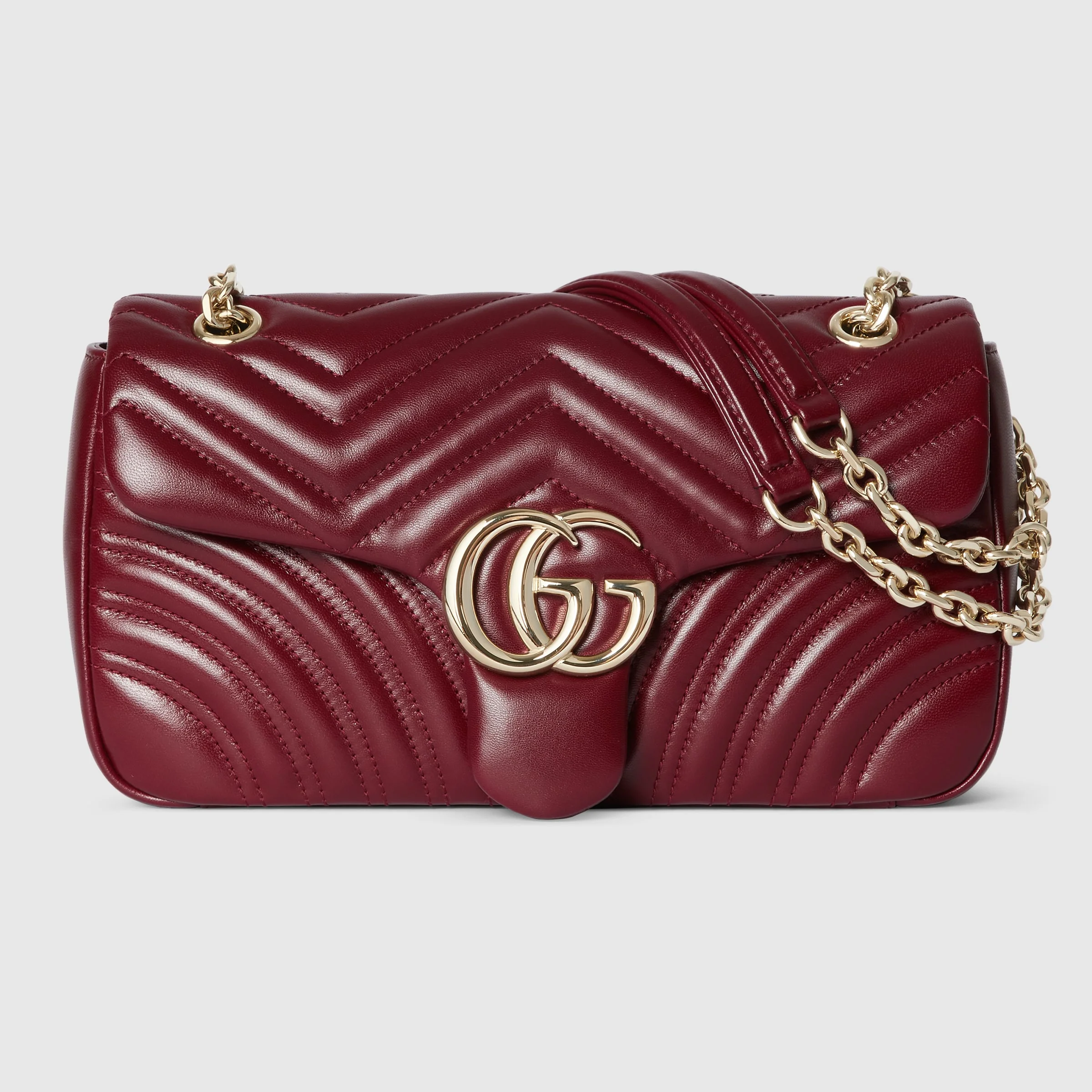 The GG Marmont, a signature collection of the House, features the Double G hardware, a faceted chain strap, and soft construction in an exceptionally supple leather. A sleek back pocket introduces a functional touch to the medium and large sizes. - Gucci Rosso Ancora red matelasse chevron lambskin leather - Light gold-toned hardware - Gucci Rosso Ancora red viscose lining - Double G - Inside: 1 zip pocket - Outside: 1 open pocket - Sliding chain strap can be worn as a shoulder strap with 22" drop - Flap with spring closure - 10.2" x 5.9" x 2.8" - Weight: 1.4lbs approximately - Made in Italy - Fits iPhone Pro Max/Plus, Airpods, long wallet, and lipstick
