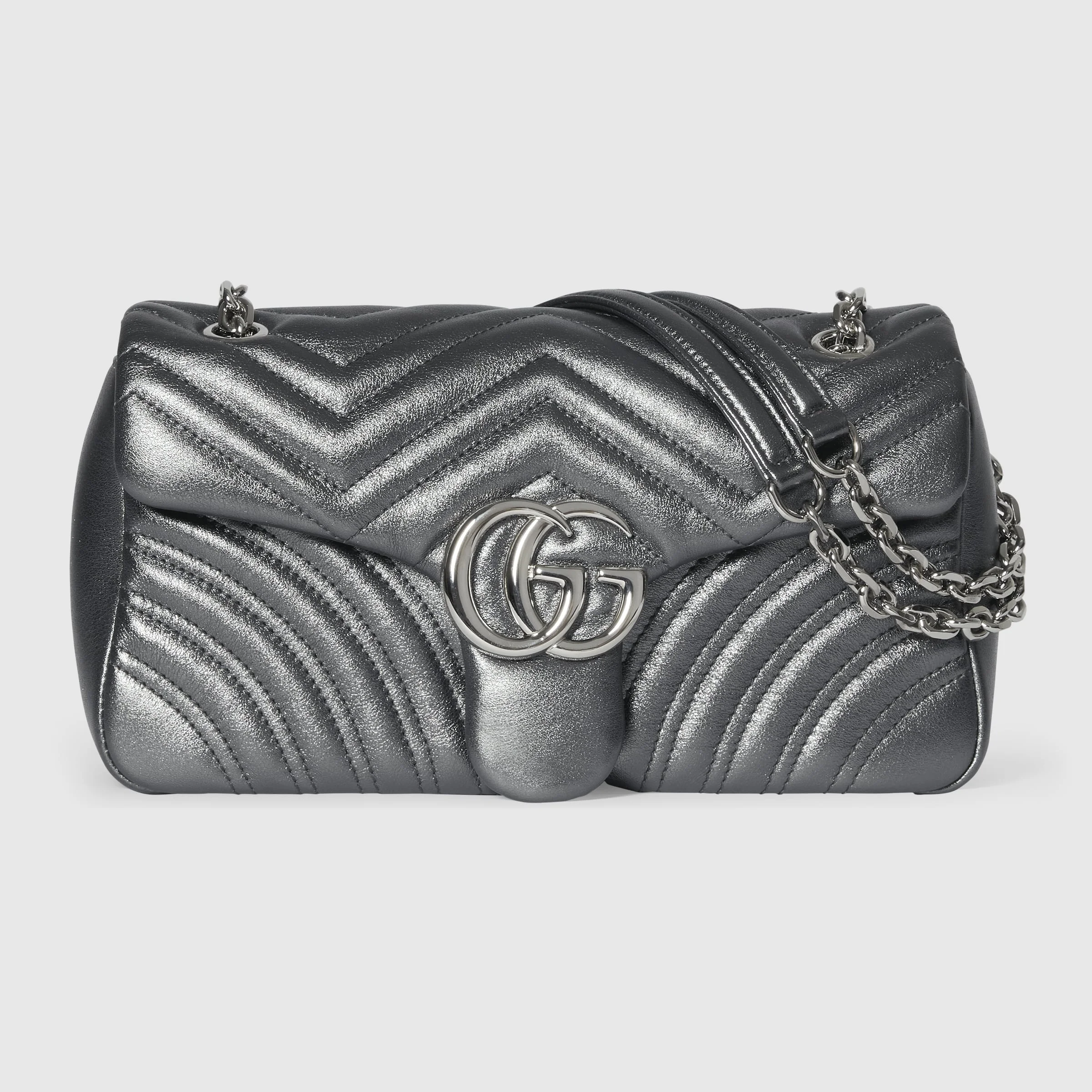 The GG Marmont, a signature collection of the House, features the emblematic Double G and a faceted chain strap, presented here in silver-toned finish. This shoulder bag style is crafted from lame leather, in a timeless shade of grey. - Dark grey matelasse chevron lame leather - Silver-toned hardware - Black viscose lining - Double G - Inside: 1 zip pocket - Outside: 1 open pocket - Sliding chain strap can be worn as a shoulder strap with 22" drop - Flap with spring closure - 10.2" x 5.9" x 2.8" - Weight: 1.4lbs approximately - Made in Italy - Fits iPhone Pro Max/Plus, Airpods, long wallet, and lipstick