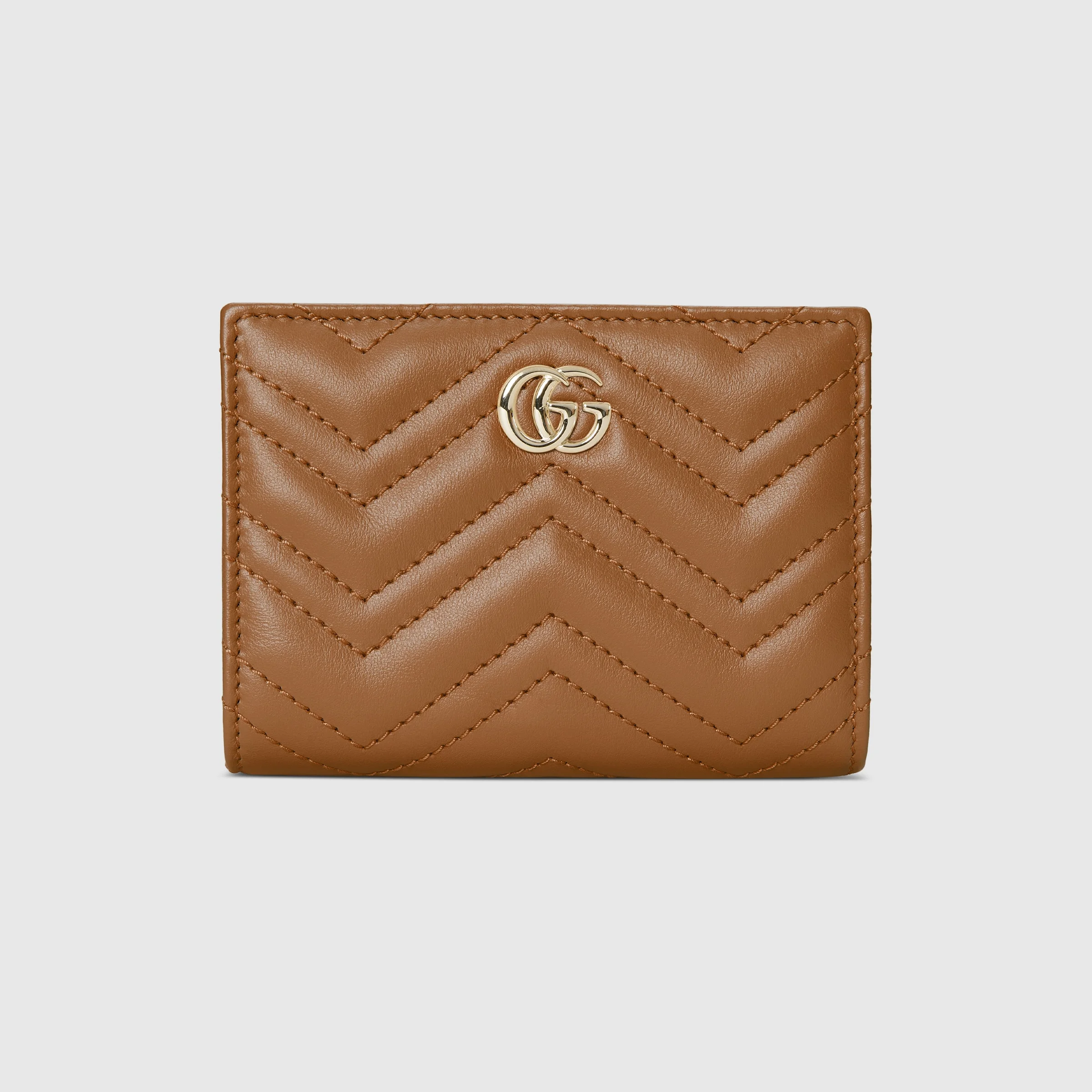 This GG Marmont wallet is presented in matelasse leather in brown. The style is completed with the line's signature Double G hardware. - Brown matelasse chevron leather - Light gold-toned hardware - Brown taffeta lining - Double G - Inside: 8 card slots, 1 bill compartment - 1 zip compartment - Snap button closure - Weight: 0.29lbs approximately - 4.3"W x 3.1"H x 1.2"D - Made in Italy