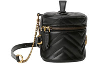 The mini backpack has a contemporary rounded shape in black matelassé leather, completed with chain shoulder straps and a top handle. Part of the GG Marmont collection, the style is defined by the three-dimensional Double G hardware—an archival-inspired stylizing of the initials of the House. - Black matelassé chevron leather with a heart on the back - Antique gold-toned hardware - Double G - Top handle - Adjustable chain and leather straps - Zipper closure - Weight: .326kg approximately - 6.7"W x 4.7"H x 6.3"D - Microfiber lining with a suede-like finish - Made in Italy - The model is 5'10" tall
