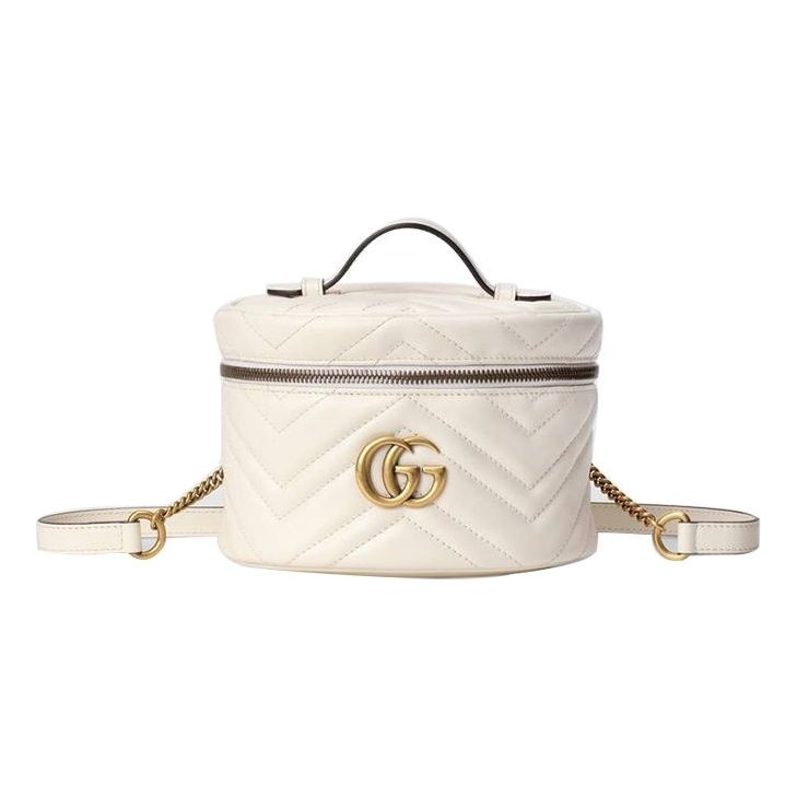 The mini backpack has a contemporary rounded shape in white matelassé leather, completed with chain shoulder straps and a top handle. Part of the GG Marmont collection, the style is defined by the three-dimensional Double G hardware—an archival-inspired stylizing of the initials of the House. - White matelassé chevron leather with a heart on the back - Antique gold-toned hardware - Double G - Top handle - Adjustable chain and leather straps - Zipper closure - Weight: .326kg approximately - 6.7"W x 4.7"H x 6.3"D - Microfiber lining with a suede-like finish - Made in Italy - The model is 5'7" tall