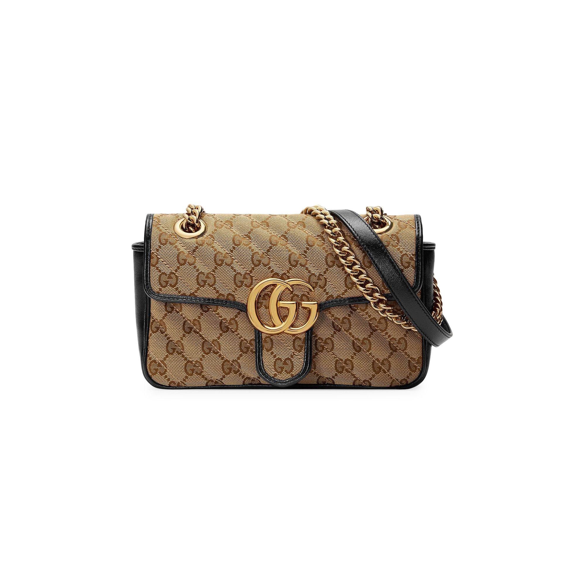 The mini GG Marmont chain shoulder bag is reimagined with a strong logo connotation for Spring Summer 2020, trimmed with black leather. The softly structured shape is presented in diagonal matelassé Original GG canvas, paired with the archival Double G hardware on the flap closure. The sliding chain strap smoothly transforms from a single shoulder length to a doubled top handle length for multiple ways to wear the bag. - Beige/ebony Original GG canvas - Black leather trim - Shiny gold-toned hardware - Microfiber lining with a suede-like finish - Double G - Internal open pocket for larger phones - Sliding chain strap can be worn as a shoulder strap with 22" drop or can be worn as a top handle with 12" drop. Can also be worn cross body. - Flap with spring closure - This item can fit a cell phone up to 3.1”W x 6.2”H x .3”D - The Gucci card case wallet will fit inside this product - Weight: .6kg approximately - Mini size: 8.5"W x 5"H x 2.5"D - Made in Italy - The model is 5'7" tall