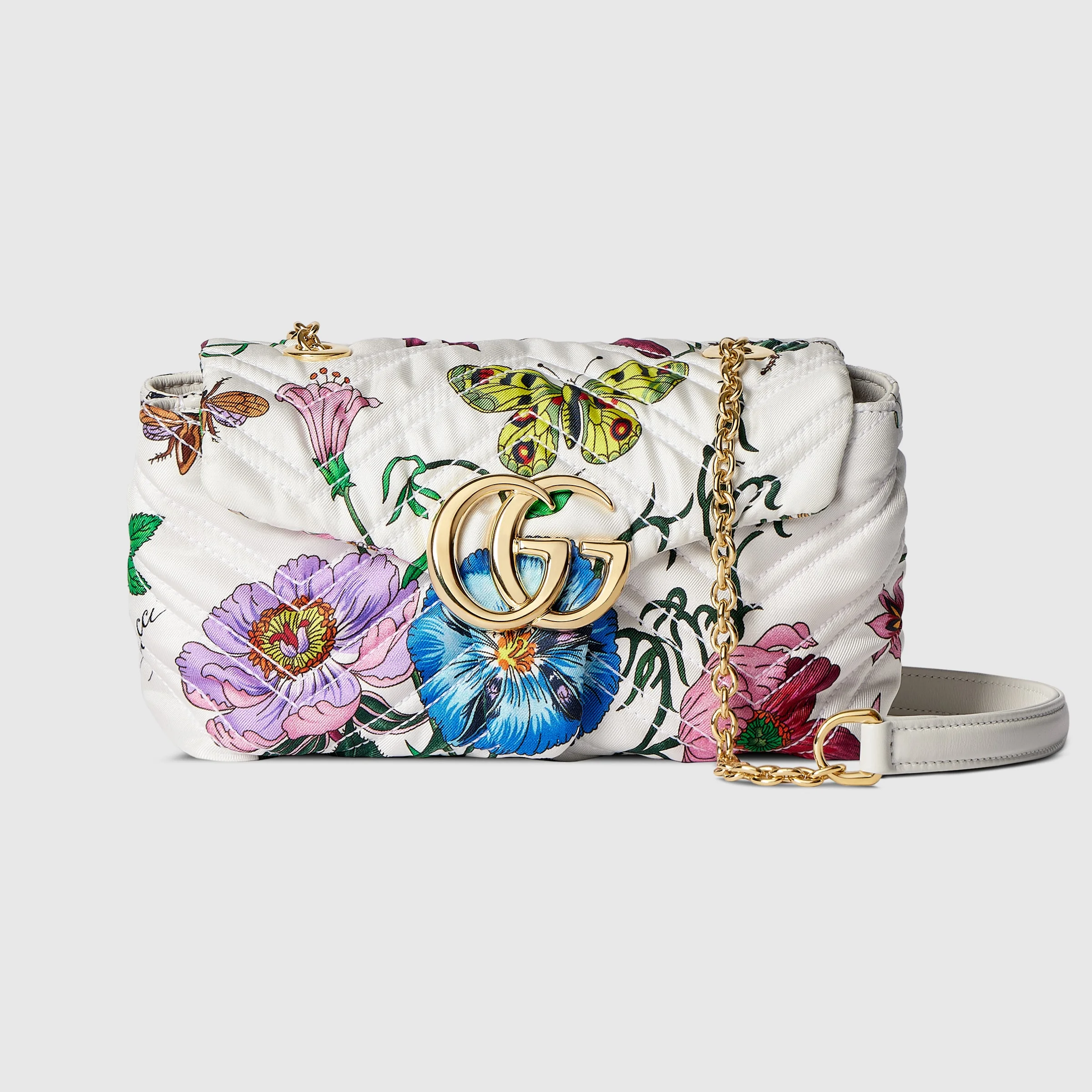 Introducing Spring Summer 2026. This GG Marmont style highlights one of the House's signature styles in vivid colors. Crafted from Flora-motif silk twill, it is complete with gold-toned hardware. - White and multicolor Flora silk twill - Gold-toned hardware - Light pink silk satin lining - Double G - Chain shoulder strap drop: 21.7" - Snap button closure - 7.3"W x 4.5"H x 2.8"D - Weight: 12.8oz approximately - Made in Italy - Fits iPhone Pro Max/Plus, Airpods, card case, and lipstick