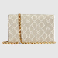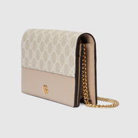 The Double G hardware appears in petite dimensions atop this GG Marmont mini chain bag for a subtle logo feel. Delicate color combinations add an unexpected twist to signature House leathergoods. This accessory appears in a mix of beige and white GG Supreme canvas with oatmeal leather trim. - Beige and white GG Supreme canvas - Oatmeal leather trim - Gold-toned hardware - Moiré lining - Double G - Interior zipper and open pockets - Six card slots - Mirror - Removable chain shoulder strap with 23.5" drop - Snap button closure - 8"W x 5"H x 1.5"D - Made in Italy