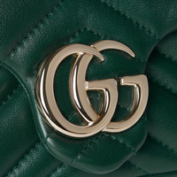 The GG Marmont introduces mini silhouettes in a fresh palette, such as this mini shoulder bag in green matelasse chevron leather, complete with the Double G hardware in a light gold-toned finish. - Green matelasse chevron nappa leather - Light gold-toned hardware - Tonal fabric lining - Double G - Chain shoulder strap with 23.6" drop - Magnetic snap closure - Weight: 0.77lbs approximately - W6.5" x H3.7" x D1.8" - Made in Italy - Fits up to iPhone Pro, Airpods, card case, and lipstick