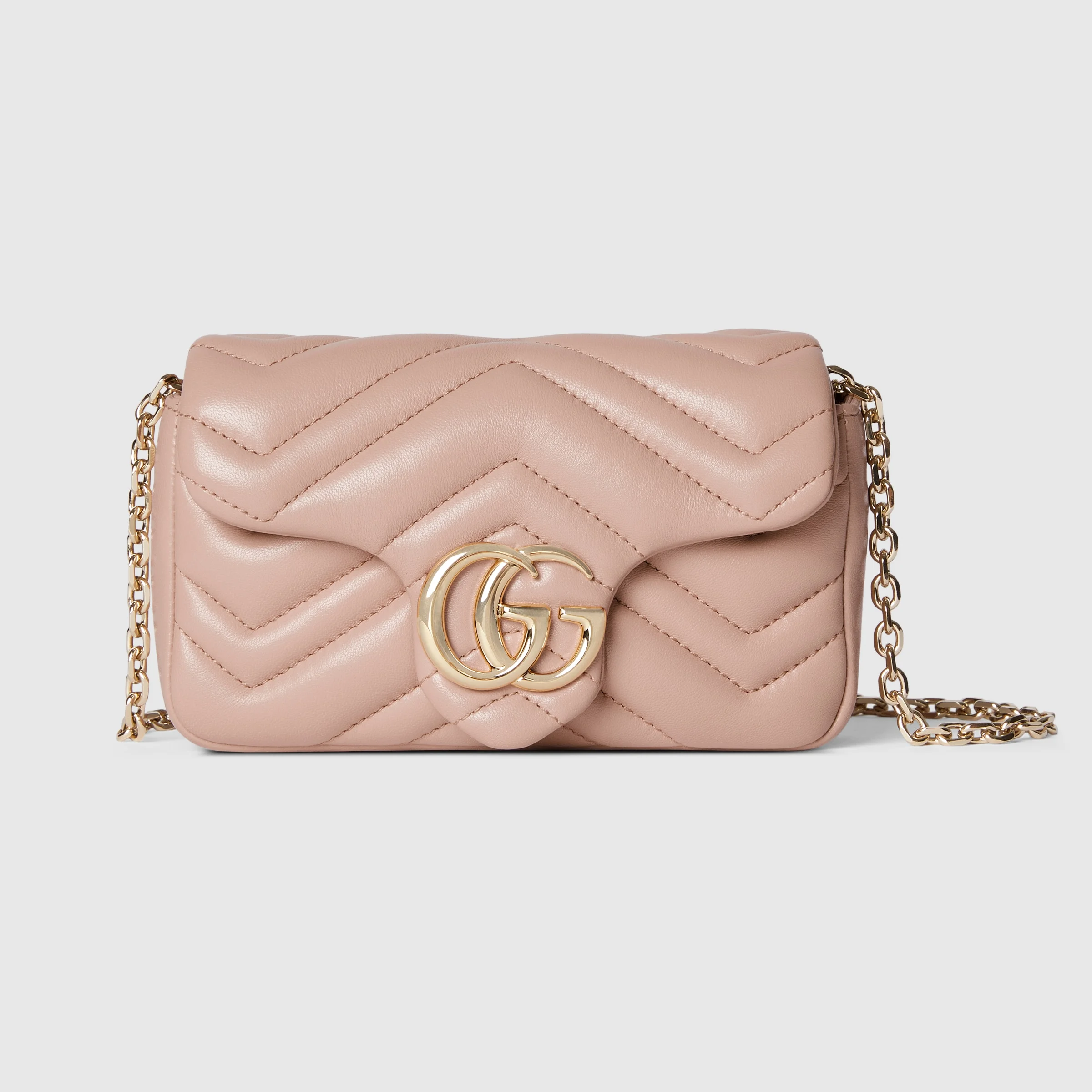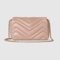The GG Marmont introduces mini silhouettes in a fresh palette, such as this mini shoulder bag in pink beige matelasse chevron leather, complete with the Double G hardware in a light gold-toned finish. - Pink beige matelasse chevron nappa leather - Light gold-toned hardware - Tonal fabric lining - Double G - Chain shoulder strap with 23.6" drop - Magnetic snap closure - Weight: 0.77lbs approximately - W6.5" x H3.7" x D1.8" - Made in Italy - Fits up to iPhone Pro, Airpods, card case, and lipstick