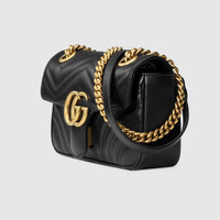 The small GG Marmont flap bag has a softly structured shape and an flap closure with Double G hardware. The sliding chain strap can be worn multiple ways, changing between a shoulder and a top handle bag. Made in matelassé chevron leather with a heart on the back. - Black matelassé chevron leather with a heart - Antique gold-toned hardware - Double G - Sliding chain strap can be worn as a shoulder strap with 55cm drop or can be worn as a top handle with 30cm drop. Can also be worn cross body. - Flap with spring closure - Weight: .6kg approximately - Mini size: 8.5"W x 5"H x 2.5"D - Made in Italy - The model is 178cm - Fits up to: iPhone Pro Max/Plus, Airpods, small wallet, and lipstick