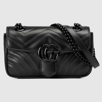 The mini GG Marmont chain shoulder bag has a softly structured shape and an oversized flap closure with Double G hardware. The sliding chain strap can be worn multiple ways, changing between a shoulder and a top handle bag. Made in matelassé chevron leather, the accessory is introduced for Gucci Love Parade with monochrome hardware. - Black matelassé chevron leather - Black brass hardware with ceramic effect finishing - Double G - Sliding chain strap can be worn as a shoulder strap with 55cm drop or can be worn as a top handle with 30cm drop. Can also be worn cross body. - Flap with spring closure - Weight: .6kg approximately - Mini size: 8.5"W x 5"H x 2.5"D - Made in Italy - Fits up to: iPhone Pro Max/Plus, Airpods, small wallet, and lipstick