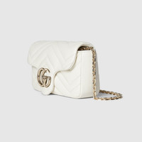 The GG Marmont, a signature collection of the House, features the Double G hardware, a faceted chain strap, and soft construction in an exceptionally supple leather. This mini bag is complete with the archival logo, first introduced in the 1970s. - White matelasse chevron lambskin leather - Silver-toned hardware - Red ottoman lining - Double G - Chain shoulder strap with 23.6" drop - Magnetic snap button closure - Weight: 0.77lbs approximately - W6.5" x H3.7" x D1.8" - Made in Italy - Fits up to iPhone Pro Max/Plus, Airpods, card case, and lipstick
