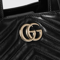 In the Fall Winter 2025 collection, part of the GG Marmont line, this tote bag introduces a new silhouette to the collection. Crafted from matelasse chevron lambskin leather, it features light gold-toned hardware and the emblematic Double G. The soft yet structured design is completed with top handles and a chain shoulder strap, offering versatile styling options. - Black matelasse chevron lambskin leather - Light gold-toned hardware - Gucci Rosso Ancora red viscose lining - Double G - Inside: open pocket - Handle with 4.3" drop - Shoulder strap with 20.9" drop (17.7" when bag is closed) - W7" (11.4") x H7" x D5" - Weight: approximately 0.88lbs - Fits iPhone Pro Max/Plus, Airpods, long wallet, and lipstick