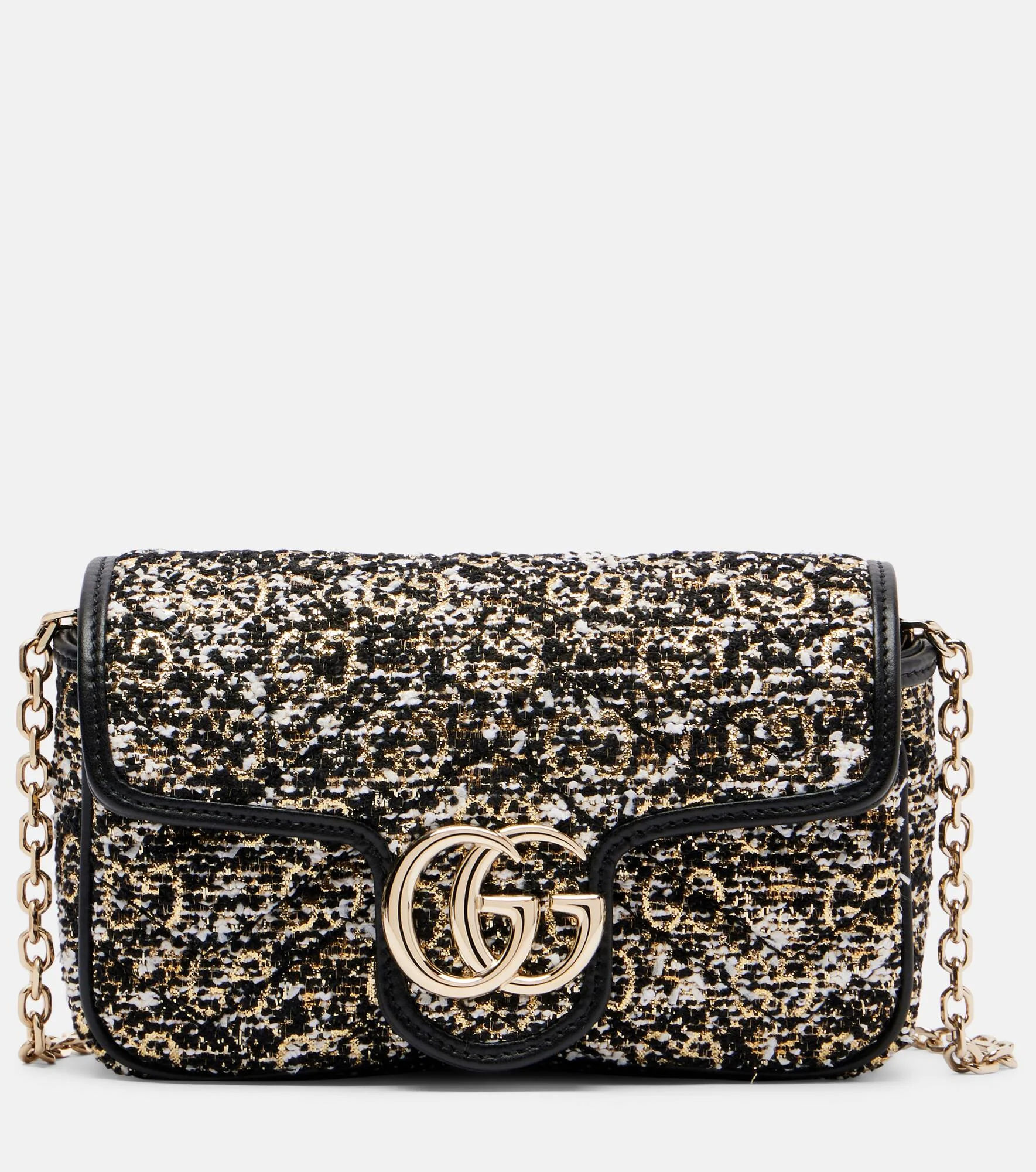 This Mini iteration of the GG Marmont shoulder bag from Gucci is crafted in Italy from tweed with light catching metallic fibers. The design is complete with a detachable chain strap and secure magnetic fastening. Product Details - Material: fabric - Lining: fabric - Made in Italy - Designer color name: Blk Whit.Melange/Blk - Item color: multicolor - Trim: leather - Hardware color: gold - Closure: magnetic fastening - Detachable chain shoulder strap - Includes: dust bag, box - Item number: P01118090 Size & Fit - Height 10cm-4" - Width 17cm-6.5" - Depth 5cm-2" - Chain length 126cm-49.5"