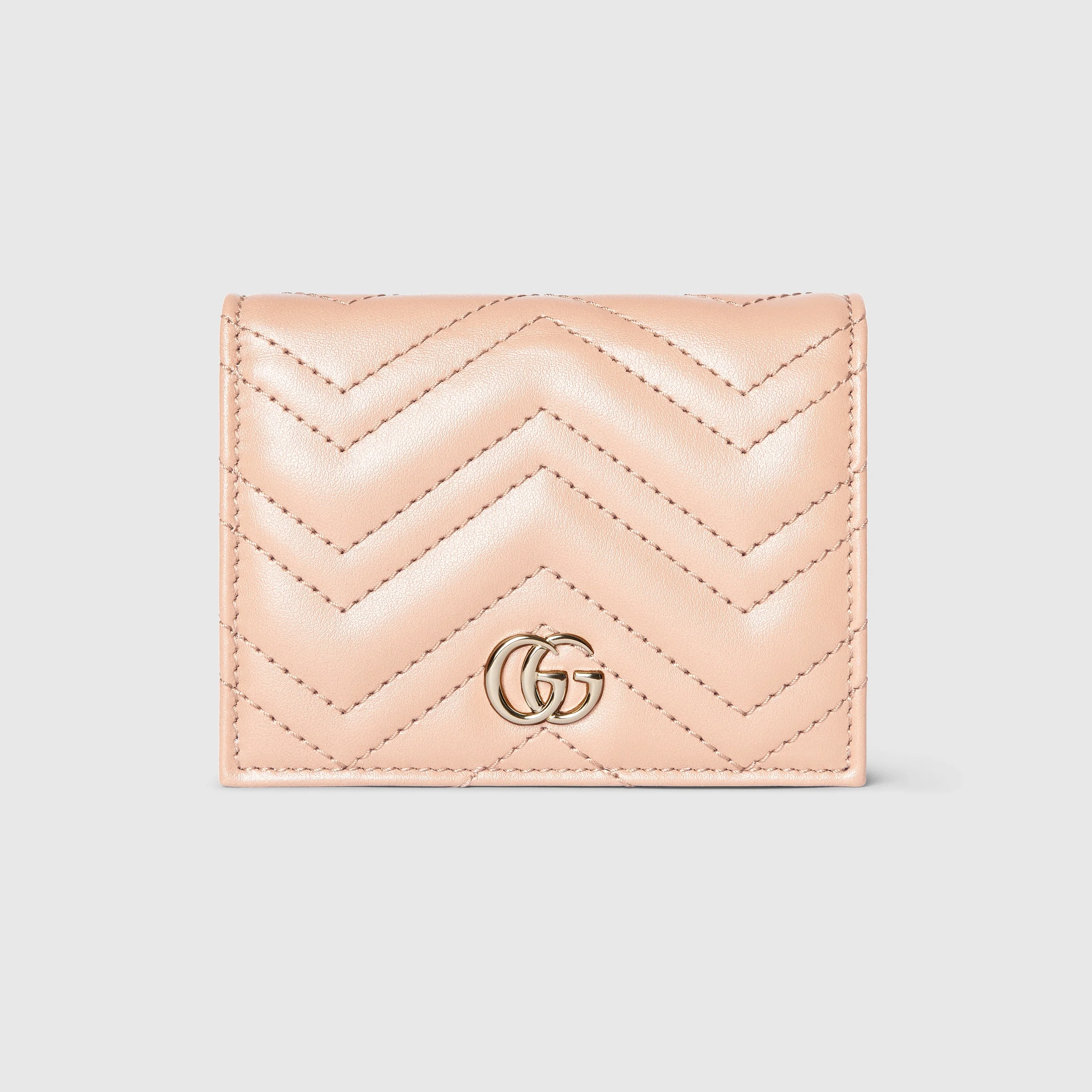 This GG Marmont wallet is crafted from the signature matelasse chevron leather. The shape is defined by the line's emblematic Double G hardware, an archival symbol from the 1970s that has become a hallmark of the House. - Pale pink matelasse chevron leather - Gold-toned hardware - White taffeta lining - Double G - Inside: 5 card slots, open pocket, 1 zipper pocket, 1 bill compartment - Snap button closure - Closed: 4.5"W x 3.5"H x 1"D, Open: 4.5”W x 7”H - Weight: 0.2lb, approximately - Made in Italy