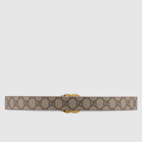 Evolving season after season, the GG Marmont's recognizable design blends the ‘70s GG hardware with contemporary styles. This GG Supreme canvas belt reverses to brown leather offering an alternative look. - Beige and ebony GG Supreme canvas, reverses to brown leather - Aged gold-toned hardware - Double G buckle - 1.2" width - Made in Italy - This belt is intended to be worn on the hips. Please refer to the style guide to find your size.