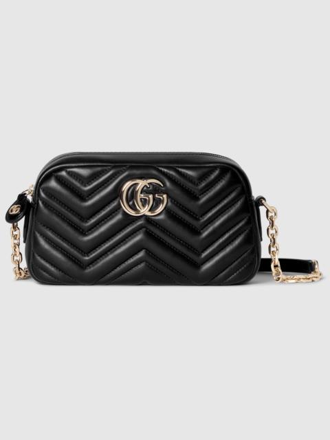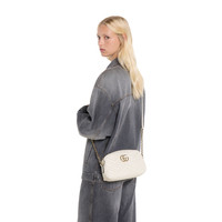 The GG Marmont, a signature collection of the House, features the emblematic Double G, a faceted chain strap, and contemporary silhouettes. The new camera bag highlights fine craftsmanship with exceptionally supple leather and intricate hardware details in light gold-toned finish. - White matelasse chevron nappa leather - Light gold-toned hardware - White viscose lining - Double G - Inside: 1 open pocket - Chain shoulder strap drop: 19.7" - Zip closure - 9.4"W x 5.9"H x 3.1"D - Weight: 1 lbs approximately - Fits iPhone Pro Max/Plus, Airpods, long wallet, and lipstick