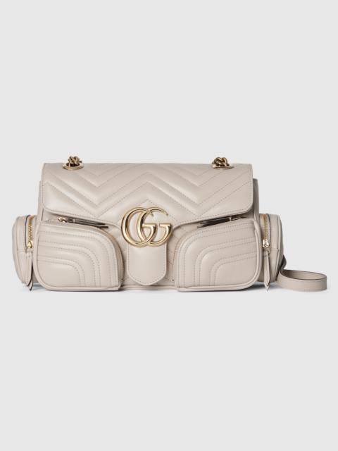 The GG Marmont line has always combined innovative material and design, and for Pre-Fall, multiple zip pockets placed on the outside further emphasize the geometry and sophistication of the matelassé chevron leather. Brown leather lining, light gold toned hardware, and an adjustable leather and chain shoulder strap completes this small shoulder bag. - Ivory matelassé chevron leather - Light gold-toned hardware - Brown leather lining - Double G - Inside: 1 open pocket - Outside: 2 zip pockets in the front and 2 zip pockets on each corner - Leather and chain adjustable shoulder strap with 11.4" - 20.4" drop - Zip closure - Weight: 31 oz, approximately - Small: 10"W x 6"H x 3"D - Fits up to: iPhone Plus, zip around wallet, Airpods, and lipstick