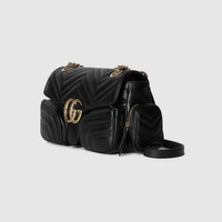 The GG Marmont line has always combined innovative material and design, and for Pre-Fall, multiple zip pockets placed on the outside further emphasize the geometry and sophistication of the matelassé chevron leather. Gucci Ross Ancora leather lining, light gold toned hardware, and an adjustable leather and chain shoulder strap completes this small shoulder bag. - Black matelassé chevron leather - Light gold-toned hardware - Gucci Rosso Ancora leather lining - Double G - Inside: 1 open pocket - Outside: 2 zip pockets in the front and 2 zip pockets on each corner - Leather and chain adjustable shoulder strap with 11.4" - 20.4" drop - Zip closure - Weight: 31 oz, approximately - Small: 10"W x 6"H x 3"D - Fits up to: iPhone Plus, zip around wallet, Airpods, and lipstick