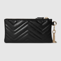 The GG Marmont pouch with chain is presented in matelasse leather. The style is completed with the line's signature Double G hardware. - Black matelasse chevron leather - Light gold-toned hardware - Black taffeta lining - Double G - Inside: 2 open compartments - Handle drop: 5.9" - Detachable chain strap drop with 20.8" drop - Zip closure - 8.6"W x 4.7"H x 0.7"D - Weight: 0.5lb, approximately - Fits up to iPhone Pro, card case, and lipstick