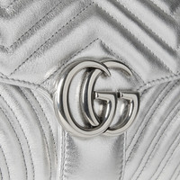 From mirrored leather to sparkling crystals and elegant velvet, Gucci provides a range of pieces for the gifting season. Choose from the selection of signature handbags to add a touch of style. - Metallic silver leather - Antiqued shiny palladium hardware - Red cotton linen lining - Double G - Interior zipper pocket - Sliding chain strap can be worn as a shoulder strap with 21.6" drop or can be worn as a top handle with 11.8" drop. - Flap with spring closure - Small: 10"W x 6"H x 3"D - Weight: 1.42lbs approximately - Made in Italy - Fits iPhone Pro Max/Plus, Airpods, long wallet, and lipstick
