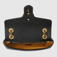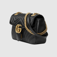 The small GG Marmont camera bag has a softly structured shape and a flap closure with Double G hardware. The sliding chain strap can be worn multiple ways, changing between a shoulder and a top handle bag. Made in matelassé chevron leather with a heart on the back. - Black matelassé chevron leather with a heart - Antique gold-toned hardware - Made in Italy - Double G - Interior zipper pocket - Sliding chain strap can be worn as a shoulder strap with 21.6" drop or can be worn as a top handle with 11.8" drop. - Flap with spring closure - Weight: 1.42lbs approximately - Small size: 10"W x 6"H x 3"D - Made in Italy - The model is 178cm - Fits up to: iPhone Pro Max/Plus, Airpods, long wallet, and lipstick